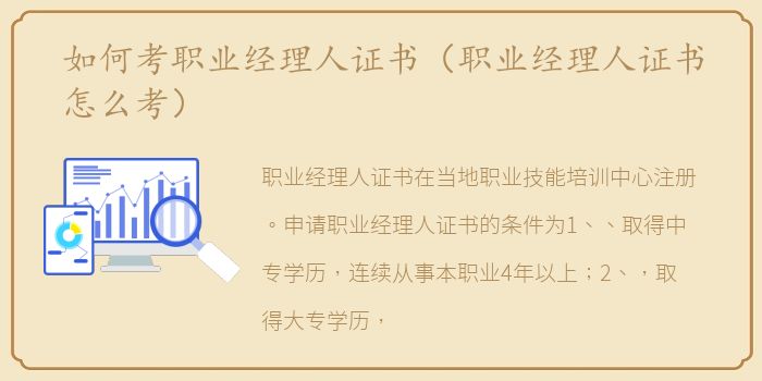 职业经理人证书在当地职业技能培训中心注册。申请职业经理人证书的条件为1、、取得中专学历,连续从事本职业4年以上;2、,取得大专学历,连续从事本职业2年以上;3、,获得学士学位,并连续从事本职业1年以上;4、获得初级中国职业经理人资格认证2年。