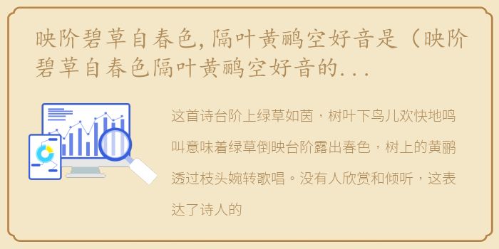 这首诗台阶上绿草如茵,树叶下鸟儿欢快地鸣叫意味着绿草倒映台阶露出春色,树上的黄鹂透过枝头婉转歌唱。没有人欣赏和倾听,这表达了诗人的怨恨,他的才华没有得到满足,同时,表达了诗人忧国忧民的情怀。