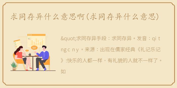 "求同存异手段:求同存异。发音:qi t ng c n y 。来源:出现在儒家经典《礼记乐记》:快乐的人都一样,有礼貌的人就不一样了。如果你对对方视而不见,如果你与众不同,你就会尊重对方;赢了就流;如果你赢了,你就会离开。"