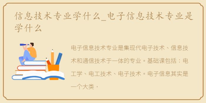 电子信息技术专业是集现代电子技术、信息技术和通信技术于一体的专业。基础课包括:电工学、电工技术、电子技术。电子信息其实是一个大类,也包含六个具体专业。