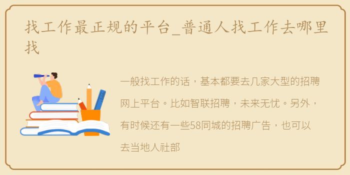 一般找工作的话,基本都要去几家大型的招聘网上平台。比如智联招聘,未来无忧。另外,有时候还有一些58同城的招聘广告,也可以去当地人社部门组织的现场招聘会。一般可能会有及时的招聘需求,及时与企业沟通。