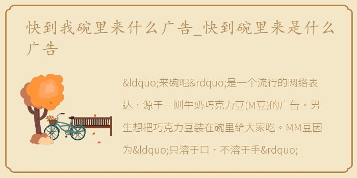 “来碗吧”是一个流行的网络表达,源于一则牛奶巧克力豆(M豆)的广告。男生想把巧克力豆装在碗里给大家吃。MM豆因为“只溶于口,不溶于手”的特性,不愿意进碗。广告中,男孩招待朋友,去拿巧克力。他拿了一个碗,对巧克力豆说:“到碗里来!””巧克力豆说,“你只管去拿碗!""