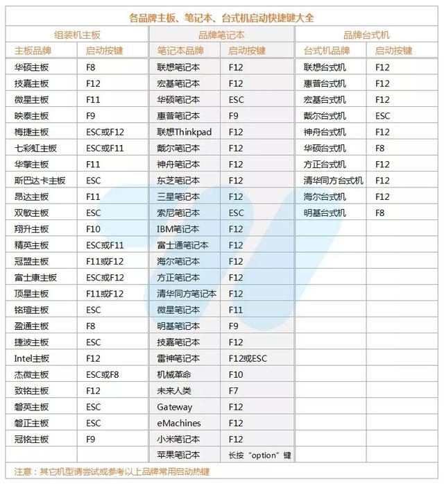 重启电脑,按电脑启动热键,选择我们的U盘。启动热键参考如下图: