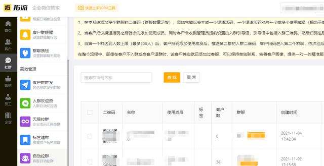 这时我们可以用企业微信服务商——拓流SCRM的自动拉群功能,客户扫码先添加群主,添加成功后,客户再扫码进群,能保证入群的客户,都沉淀到企业微信上。
