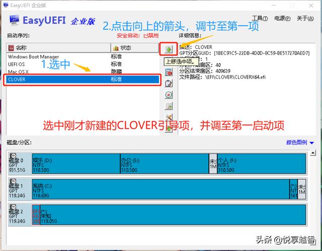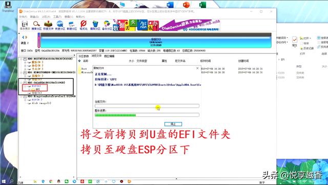 六、更改硬盘启动1.打开分区工具,把刚刚的EFI文件夹里的clover文件夹拷贝到硬盘的ESP分区(跟之前一样,用快捷键拷贝);