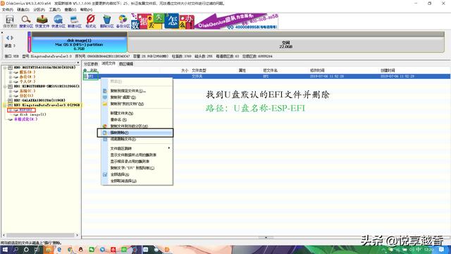 1.打开分区工具DiskGenius,找到U盘上的ESP分区,删除自带的EFI文件。