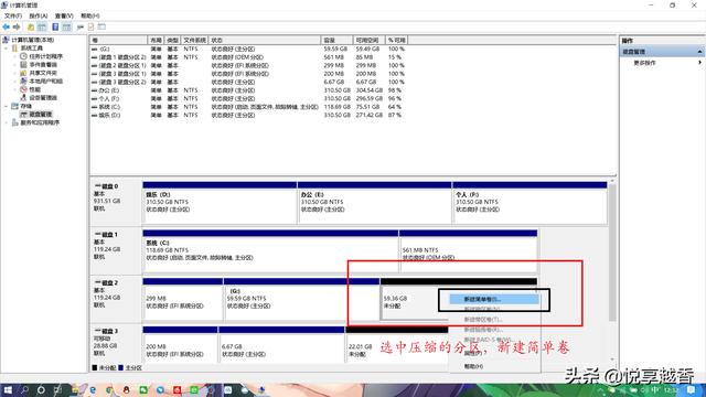 e.接下来选中被压缩的分区,右键新建简单卷。