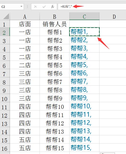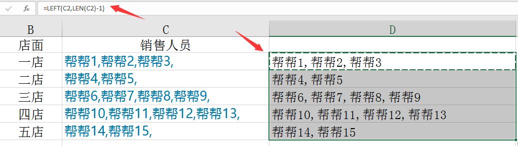 最后那个逗号看着不舒服,来个函数=LEFT(C2,LEN(C2)-1),完成转换。