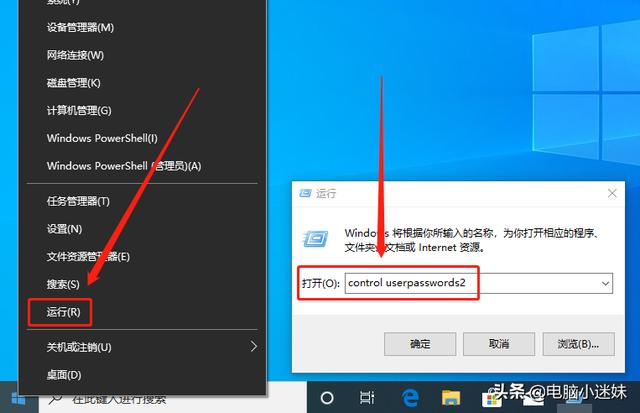 1、打开运行,输入“control userpasswords2”,点击确定:
