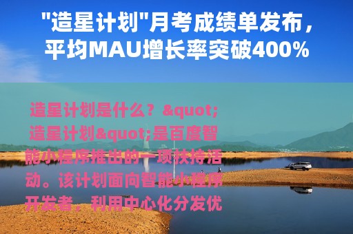 造星计划是什么? "造星计划"是百度智能推出的一项扶持活动。该计划面向智能小程序开发者,利用中心化分发优势,通过包括品牌、流量、功能等在内的一系列权益,帮助开发者,实现MAU突破10万,助力有想法、有实力的小程序在创意为王的时代脱颖而出。 经过1...