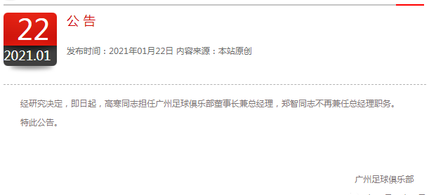 北京时间1月22日,官网广州恒大宣布任命高涵为广州足球俱乐部董事长兼总经理,郑智同志不再担任总经理职务。同时,这也是恒大新年以来的第一份重磅官方公告!