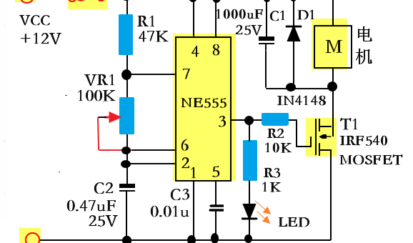当电路通电时,555多谐振荡器工作,三个引脚输出方波。通过调节电阻R2,可以改变输出方波的占空比,从而改变Q1的导通时间和关断时间,改变电机的平均工作电压,从而改变转速。