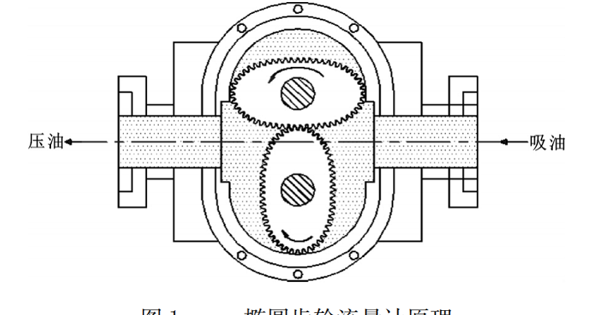 图1是椭圆齿轮流量计的示意图。当齿轮按图示方向转动时,由于相互啮合的齿轮逐渐脱开,右吸油腔中密封件的工作容积逐渐增大,从而形成局部真空。因此,油箱中的油在大气压力的作用下通过吸油管进入吸油腔,充满齿间槽,随着齿轮的转动将油吸入左油压腔。在油压区的一侧,随着齿轮在此处逐渐啮合,密封工作腔的容积不断减小,机油被挤出,从油压腔输送到压力管。在椭圆齿轮流量计的工作过程中,只要两个齿轮的旋转方向不变,吸排油腔的位置就确定不变。这里啮合点处的齿面接触线分隔了高低压腔,起到了配油的作用,因此不需要在流量计中设置专门的配流机构,这与其他容积式液体流量计不同。