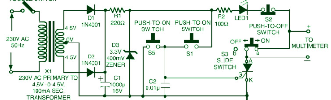 该电路工作在3V DC上,并使用齐纳二极管结合降压变压器和整流器的布置,如图所示。或者,可以使用两节铅笔电池为电路供电。