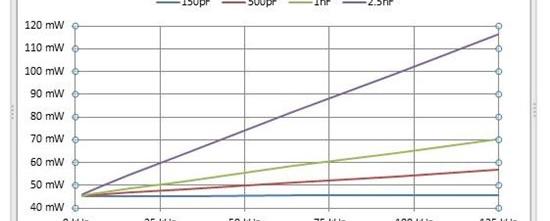 图1:1:TRS 3232 e的功耗和频率(每通道电阻为3k)