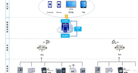 感应层:感应层主要由现场安装的综合保护、电表、无线测温设备、摄像头、烟雾传感器、水浸、门磁仪表等组成。现场设备将模拟信号转换为数字信号后,通过标准通信协议传输数据。