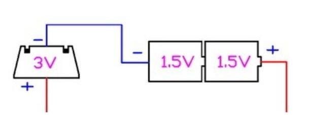 1、连接如下图所示(注:左边是要充电的纽扣电池,右边是普通干电池(最好是新的,保证每节电压1.5V左右,不要用镍镉或镍氢充电电池,额定电压1.2V,会使纽扣电池充电不充分)。