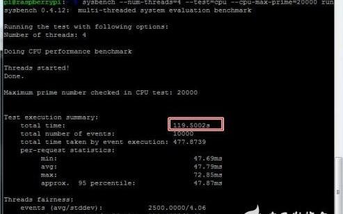 Sysbench是一款开源的多线程性能测试工具,可以最大程度的测试CPU的极限性能。测试内容是计算最大质数从0到20000所用的时间,测试时四核全开。