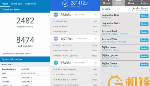 这样的硬件经常关注手机的朋友都很熟悉,这里就不细说了。小米MIX 3的跑分也达到了骁龙845芯片应有的水平。