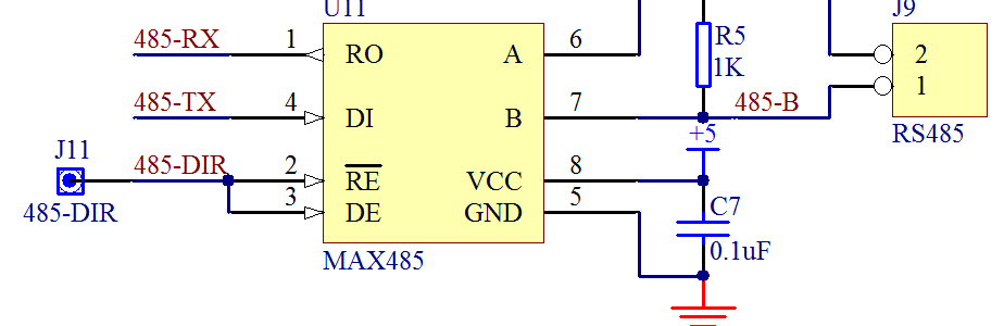 MAX485是Maxim公司推出的一款常见的RS485转换器。其中引脚5和引脚8是电源引脚;引脚6和引脚7是RS485通信中的引脚A和B。1脚和4脚分别接单片机的RXD和TXD脚,直接用单片机的UART收发数据;引脚2和引脚3为方向引脚,其中引脚2为低电平使能接收器,引脚3为高电平使能输出驱动器。我们把这两个插脚连接在一起。平时不发送数据时,这两个引脚保持低电平,使MAX485处于接收状态。需要发送数据时,拉高此引脚,发送数据,发送后拉低此引脚。为了提高RS485的抗干扰能力,需要在MAX485附近的A、B引脚之间并联一个电阻,这个电阻的阻值可以在100欧姆到1 k之间.