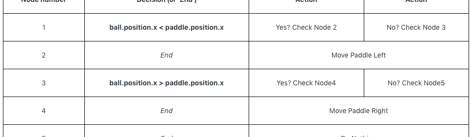 乍一看,你可能认为决策树和if语句没有区别。但在这个系统中,每个决策都包括一个确切的条件和两个可能的输出,这使得开发人员可以从表示决策树的数据中构建AI,而无需硬编码。用一个简单的表格来描述决策树是这样的: