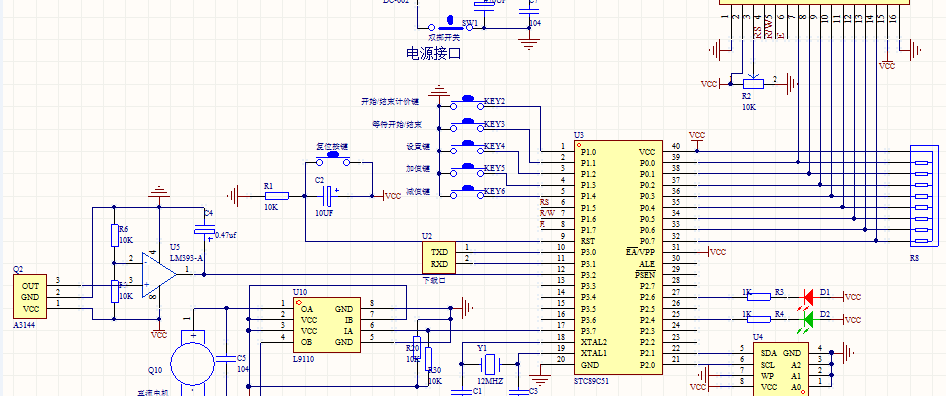 一:功能:利用单片机和霍尔传感器模拟出租车计价器。系统可以通过按钮设置计价器的起步价、里程价、等待价等。计价开始,霍尔传感器检测汽车的信息计算里程,计价结束后,显示日夜计价的总价。 二:电路图 审计刘清