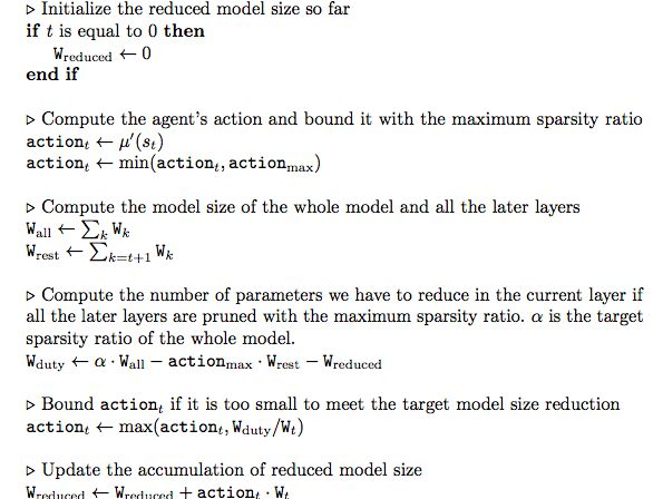 我们观察到压缩模型的精度对每一层的稀疏性非常敏感,这就需要细粒度的动作空间。因此,我们不是在离散的空间中搜索,而是通过DDPG代理提出一种连续的压缩比控制策略,通过试错来学习:精度损失时惩罚,模型降低加速时鼓励。演员-评论家的结构也有助于减少差异,促进更稳定的培训。