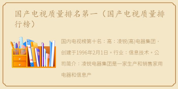 产品从1984年的单一冰箱,发展到包括白色家电、黑色家电、米色家电等86大类13000多个规格的产品群。国产电视榜单第二名:创维:创维集团是以香港创维数码控股有限公司为龙头,横跨粤港两地,生产消费电子产品的大型高科技上市公司。