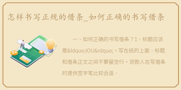 1、标题应该是“IOU”。写在纸的上面,标题和借条正文之间不要留空行。贷款人在写借条时提供签字笔比较合适,借条由借款人全文手写。