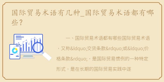 国际贸易术语,又称“交货条款”或“价格条款”,是国际贸易惯例的一种特定形式,是在长期的国际贸易实践中逐渐形成的,用于表示国际货物贸易双方在货物交付过程中的具体责任、费用和风险的专用术语。