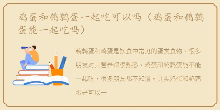 其实鸡蛋和鹌鹑蛋是可以一起吃的,但是要注意,一次吃太多容易导致消化不良。鹌鹑蛋可以和鸡蛋一起吃吗?鹌鹑蛋可以和鸡蛋一起吃,但都是同一种食物。