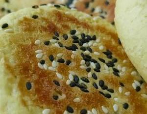 像这样就可以了,然后再把它滚圆,用手轻轻拍扁,这样一个小饼坯就做好了,再撒几粒熟芝麻在面板上,然后放上饼皮,轻轻拍打一下。两面都撒上芝麻,拍打一下,让芝麻粘的更牢固一些。