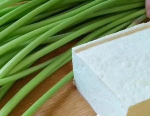 大家好,今天我们用蒜苔和豆腐来做好吃的。首先把蒜苔放一旁备用,再准备一块老豆腐,先切成厚片,再切条,最后切成小方块,切好之后装入碗中,再加一勺盐,然后倒入开水浸泡十分钟,去除豆腥味。