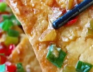 像这样就可以了,大概需要五分钟左右再把它盛出来,把它铺在包菜上,铺均匀备用,再利用煎豆腐的油,把肉丁炒一下,炒至肉丁变色,微微发黄,加入一勺黄豆酱翻炒均匀,炒出酱香味儿,然后加一勺生抽。一勺料酒,少许老抽提色,再把葱蒜末红椒也加进来,翻炒均匀,炒出香味,再把酱汁淋在豆腐上。
