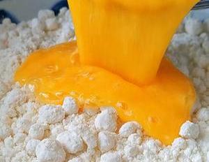 大家好,今天我们用面粉来做好吃的。首先把锅烧热,加60克食用油、动物油、植物油都可以煮2到3分钟,把油煮熟,再把油倒入300克面粉里边,倒边搅拌,搅拌成这种颗粒状,再用手把它抓散,像这样就可以了。