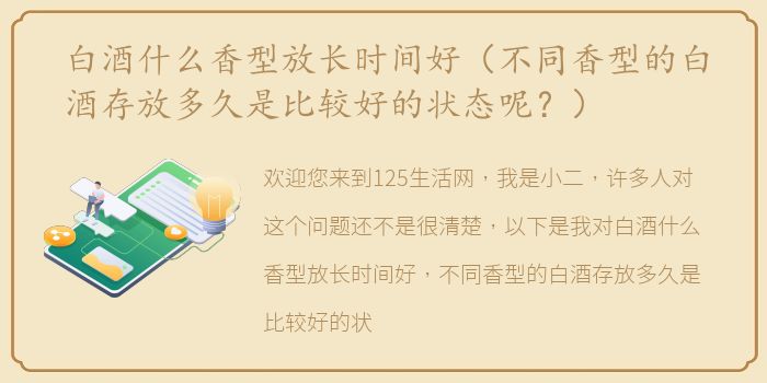 欢迎您来到125生活网,我是小二,许多人对这个问题还不是很清楚,以下是我对白酒什么香型放长时间好,不同香型的白酒存放多久是比较好的状态呢?精心的整理,预计阅读1分钟。