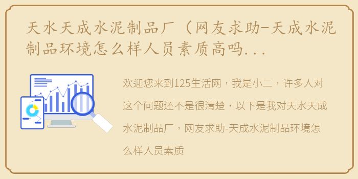 欢迎您来到125生活网,我是小二,许多人对这个问题还不是很清楚,以下是我对天水天成水泥制品厂,网友求助-天成水泥制品环境怎么样人员素质高吗?有谁知道!精心的整理,预计阅读30秒。
