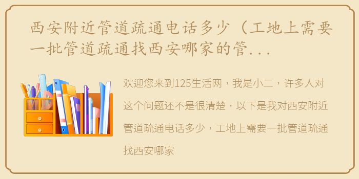 欢迎您来到125生活网,我是小二,许多人对这个问题还不是很清楚,以下是我对西安附近管道疏通电话多少,工地上需要一批管道疏通找西安哪家的管道疏通厂家比较好?精心的整理,预计阅读30秒。