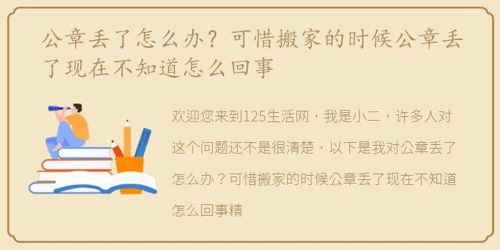 欢迎您来到125生活网,我是小二,许多人对这个问题还不是很清楚,以下是我对公章丢了怎么办?可惜搬家的时候公章丢了现在不知道怎么回事精心的整理,预计阅读30秒。