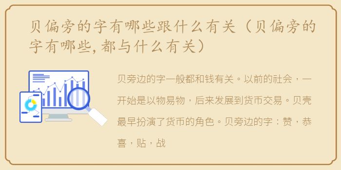 贝旁边的字一般都和钱有关。以前的社会,一开始是以物易物,后来发展到货币交易。贝壳最早扮演了货币的角色。贝旁边的字:赞,恭喜,贴,战利品,雇工,礼物,奖励,规则,赌博,贫穷,费用,礼物,金钱,质量,败北,货,便宜,购买,帐,贩,真,财,坝,贾,贪,贷,贬值,资,利,辱。