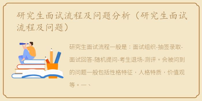 研究生面试流程一般是:面试组织-抽签录取-面试回答-随机提问-考生退场-测评。会被问到的问题一般包括性格特征,人格特质,价值观等。