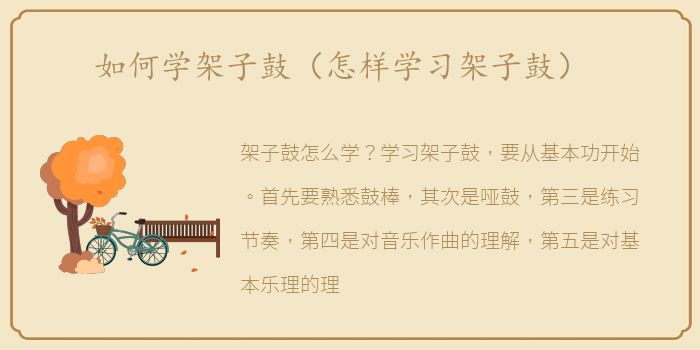 架子鼓怎么学?学习架子鼓,要从基本功开始。首先要熟悉鼓棒,其次是哑鼓,第三是练习节奏,第四是对音乐作曲的理解,第五是对基本乐理的理解,第六是完整歌曲的演奏。学习的时候,一开始也要跟着节拍器。速度不快,但一定要稳。当然,音乐识别是非常基础和重要的一项。架子鼓的乐谱和其他乐器不一样,但其实很好理解。