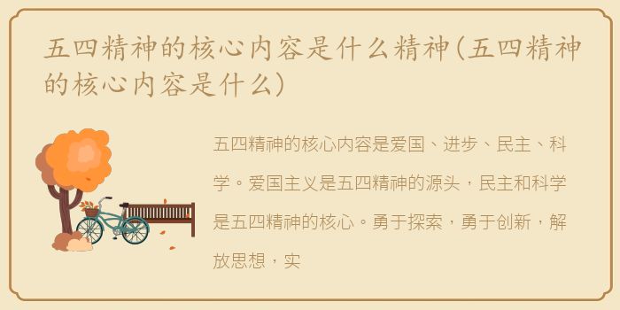 五四精神的核心内容是爱国、进步、民主、科学。爱国主义是五四精神的源头,民主和科学是五四精神的核心。勇于探索,勇于创新,解放思想,实行变革,是民主和科学的提出和实现途径。理性精神、个性解放和反帝反封建是民主和科学的内容。
