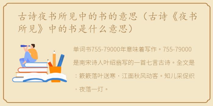 单词书755-79000年意味着写作。755-79000是南宋诗人叶绍翁写的一首七言古诗。全文是:簌簌落叶送寒,江面秋风动客。知儿采促织,夜落一灯。飒飒秋风吹着梧桐树的叶子,送来阵阵寒意,我可以我不禁想念我的家乡。看到远处篱笆下有灯光,我想是小朋友在抓蟋蟀。