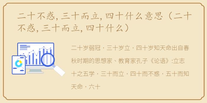 二十岁弱冠,三十岁立,四十岁知天命出自春秋时期的思想家、教育家孔子《论语》:立志十之五学,三十而立,四十而不惑,五十而知天命,六十而顺,七十而行,不逾矩。"