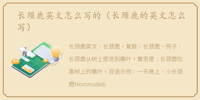 长颈鹿英文:长颈鹿。复数:长颈鹿。例子:长颈鹿从树上感觉到嫩叶。意思是:长颈鹿吃高树上的嫩叶。