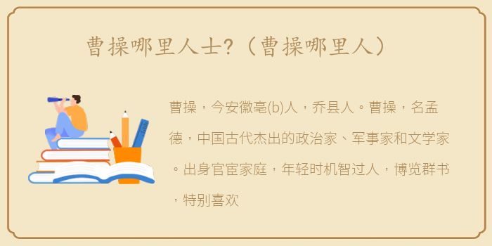 曹操,今安徽亳(b)人,乔县人。曹操,名孟德,中国古代杰出的政治家、军事家和文学家。出身官宦家庭,年轻时机智过人,博览群书,特别喜欢兵法。Xi平建安元年,曹操升为孝宗,京师洛阳,任郎。不久,他被任命为洛阳的北方尉。