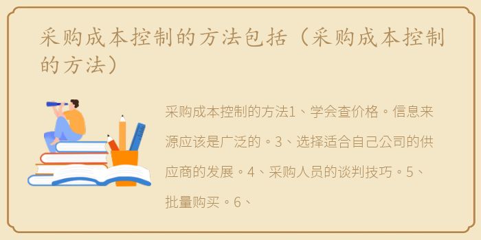 采购成本控制的方法1、学会查价格。信息来源应该是广泛的。3、选择适合自己公司的供应商的发展。4、采购人员的谈判技巧。5、批量购买。6、建立企业采购信誉。7、建立月度供应商评分系统(从质量、价格、服务三个方面)。8、建立采购人员月度绩效评估制度。9、有效控制采购库存。