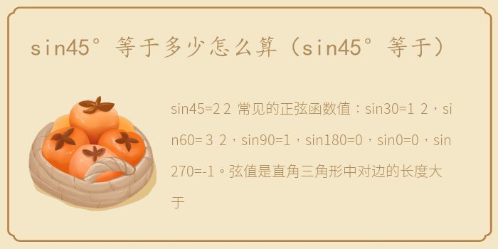 sin45=2/2 .常见的正弦函数值:sin30=1 2,sin60= 3 2,sin90=1,sin180=0,sin0=0,sin270=-1。