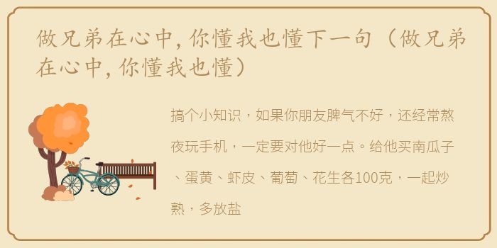 搞个小知识,如果你朋友脾气不好,还经常熬夜玩手机,一定要对他好一点。给他买南瓜子、蛋黄、虾皮、葡萄、花生各100克,一起炒熟,多放盐,让它坚持每天吃一顿。